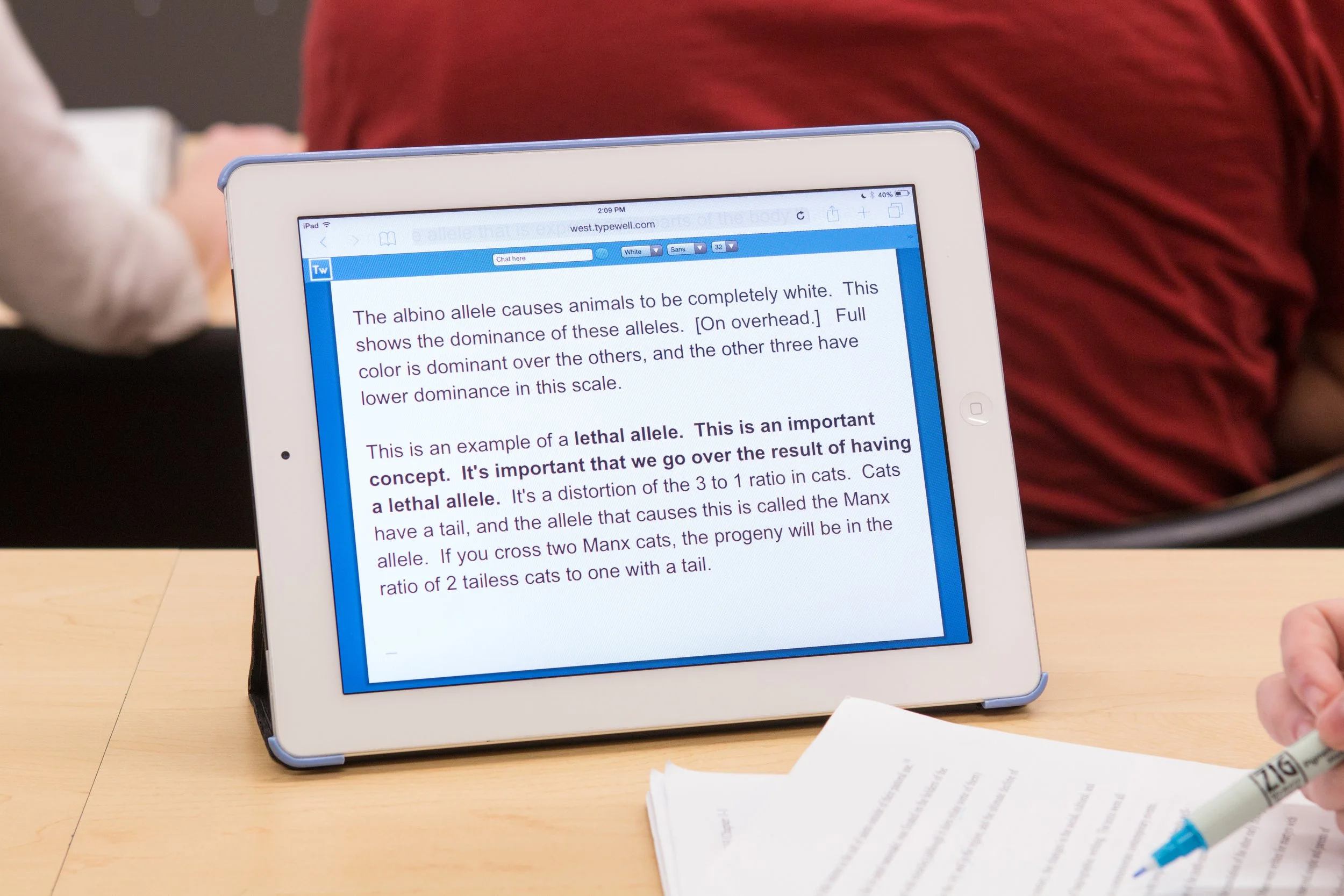 Our TypeWell live captions are shown on an iPad during a classroom genetics lecture.